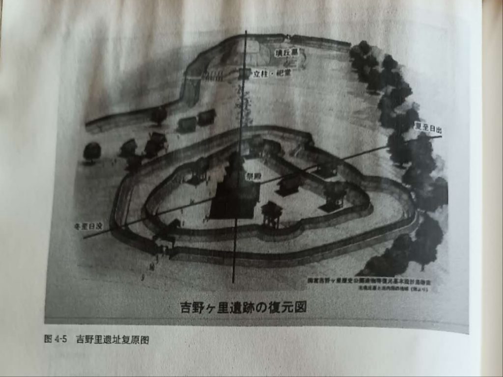 面是八方形(当时新闻报道为八方形,后世的风化以及地貌变迁导致原来形状已不可考,圆形可能性比较大)坟丘墓,中轴线的正南方位上的主祭坛呈方形。根据佐贺县教育委员会负责发掘的官员介绍,祭祀祖先的坟丘墓为圆形,复原时由于当时的认知和整体研究不到位导致现在大家看到图4-5复原的形状。日本学术界一致认为,主祭坛就是当时吉野里的“明堂”或“辟雍”。