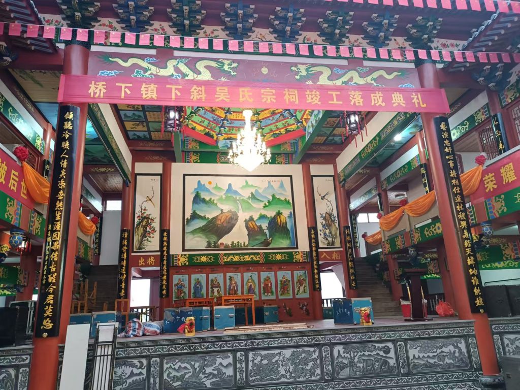 庆典仪式第五项,领导嘉宾为下斜吴氏宗祠重建竣工落成典礼剪彩。十一时二十八分,良辰吉时。主持人宣布“吴氏宗祠”揭牌仪式开始,顿时,鼓乐声声、鞭炮轰鸣。由吴氏长辈、老者、尊者及少年几十余人,手拉红绸带,在主持人的带动下,齐声拉下覆盖祠牌的神秘面纱。广场上欢呼声,喝采声骤起。缓缓揭下祠堂上方用红花红布罩着的“吴氏宗祠”四个金色大字,在深黑底色的衬托下,耀眼夺目,两旁彩绘栩栩如生,寓意“下斜福地,山青水秀,人杰地灵,家庭幸福,人丁兴旺,万世隆昌。”为铭记这一非常时刻,十门礼花同时怒放。