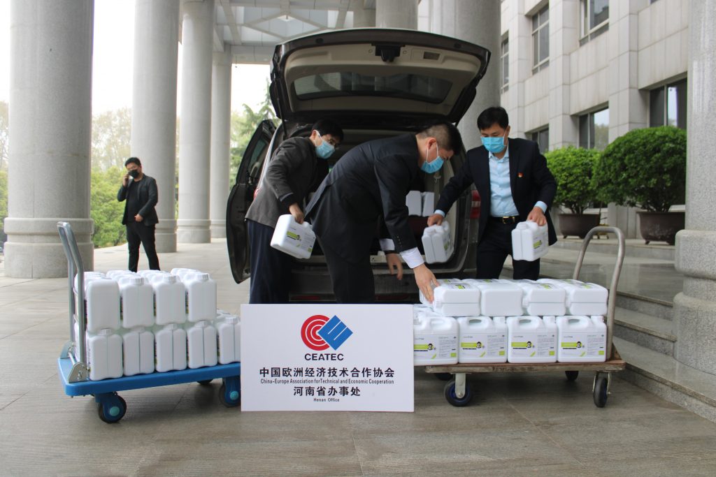 3月29日上午中国欧洲经济技术合作协会河南办事处主任钱红伟同志携同副主任兼歌瑞斯集团总经理杜喜州及办事处相关工作人员到河南省委捐赠300升歌瑞斯抗菌消毒剂。